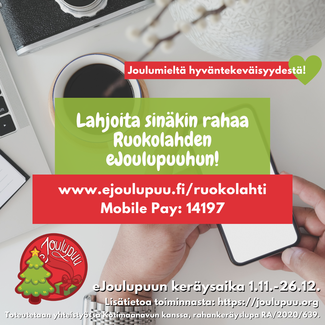Vuosia asukkaiden hartaasti toivoma joulupuu on vihdoin Ruokolahdella. Nyt teillä on mahdollisuus tukea paikallisia lapsia lahjoittamalla eJoulupuu keräykseen, tai käymällä S-marketilla (Liisanpolku 2) katsastamassa minkälaisia lappusia puussa roikkuu.